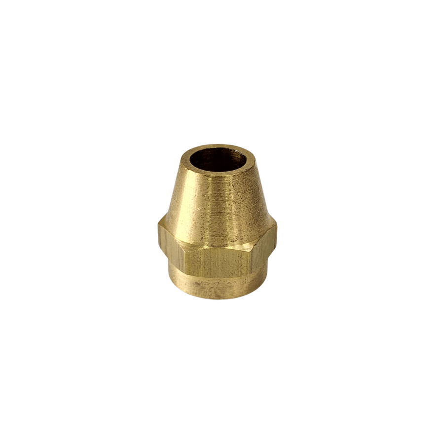 Tuerca cónica de latón con rosca hembra flare de 3/8", diseñada para asegurar conexiones flare macho en instalaciones de gas. Es ideal para sistemas de Gas LP en aplicaciones domésticas, comerciales e industriales donde se requiere un apriete firme y un sello metálico confiable en uniones flare.